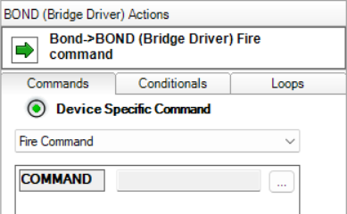 Use the bridge driver's Device Specific Command > Fire Command > COMMAND to send a command available on the Bond app that isn't available in Control4 or via our drivers (ex. tilt in a blind device has no proxy command that we can associate to it).