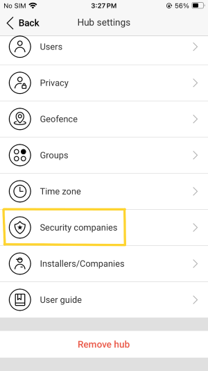 - Navigate to Hub Settings >> Security Companies >> Monitoring station