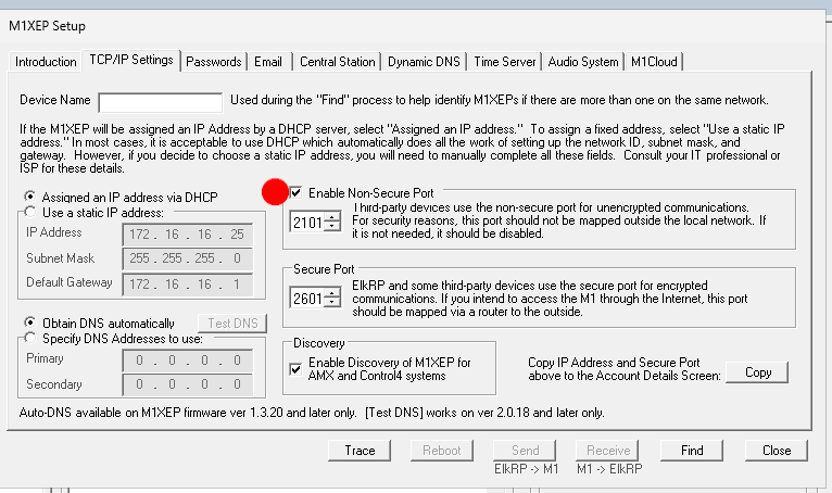 - For a M1XEP, this is normally set in ELKRP > M1XEP Setup > TCP Settings > Enable Non Secure Port. Control4 Discovery is NOT required for this driver, and it is normally recommended to use a static IP instead