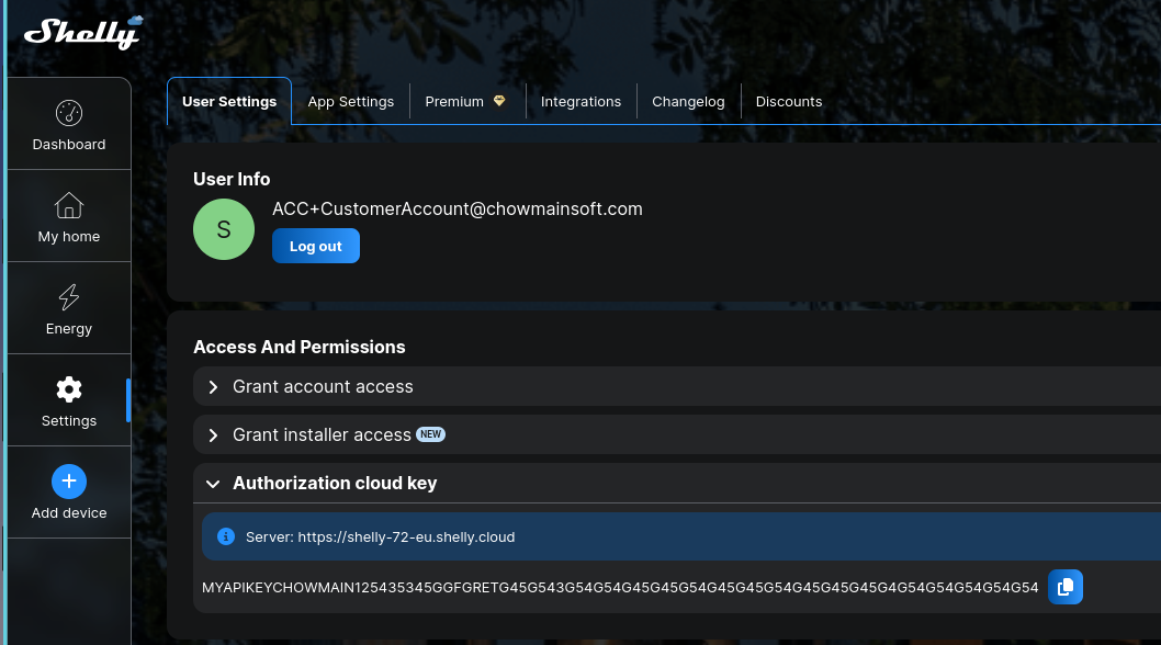- Navigate to Settings, Access And Permissions, Authorisation Cloud Key and Get API Key: