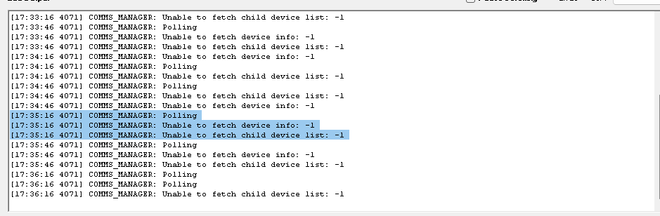 - [17:34:46 4071] COMMS_MANAGER: Unable to fetch child device list: -1