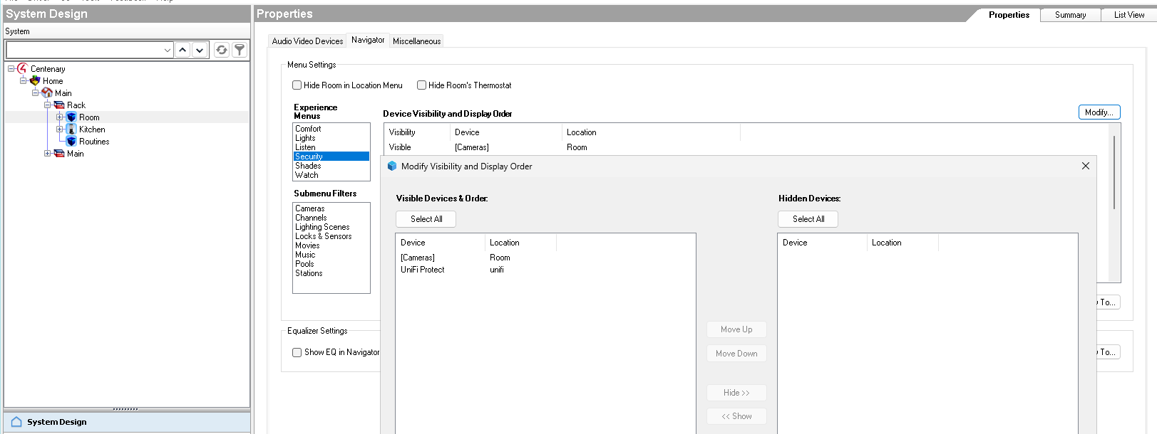 To use the interface, navigate to the project Room, Security, and enable visibility for the UniFi Protect driver