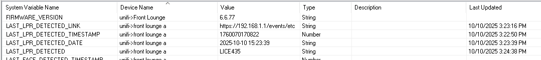 - LAST_LPR_DETECTED: Shows the Last Licence plate number which has been detected. If the Plate has been tagged with a name in UniFi Protect, the name might be used instead