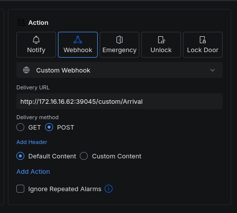 - Using the Custom Webhook URL Property in the Controller driver in Control4, set the webhook action. Change <CUSTOM_WEBHOOK_NAME> to a reference name to use. Set Delivery Method to "POST". It is not recommended to have spaces in the Delivery URL. Press Create