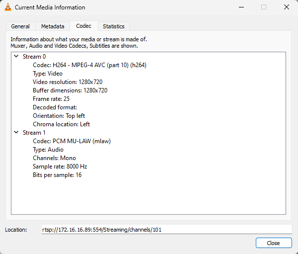 - Stream 0's Codec = H264 - and Video resolution match the above.